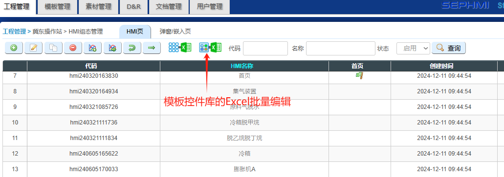 Excel的整个工程的批量编辑分为系统控件和模版控件,系统控件是指工程下所有HMI页里的控件,模版控件是指该工程下的模板控件库里的所有模版的控件组合。