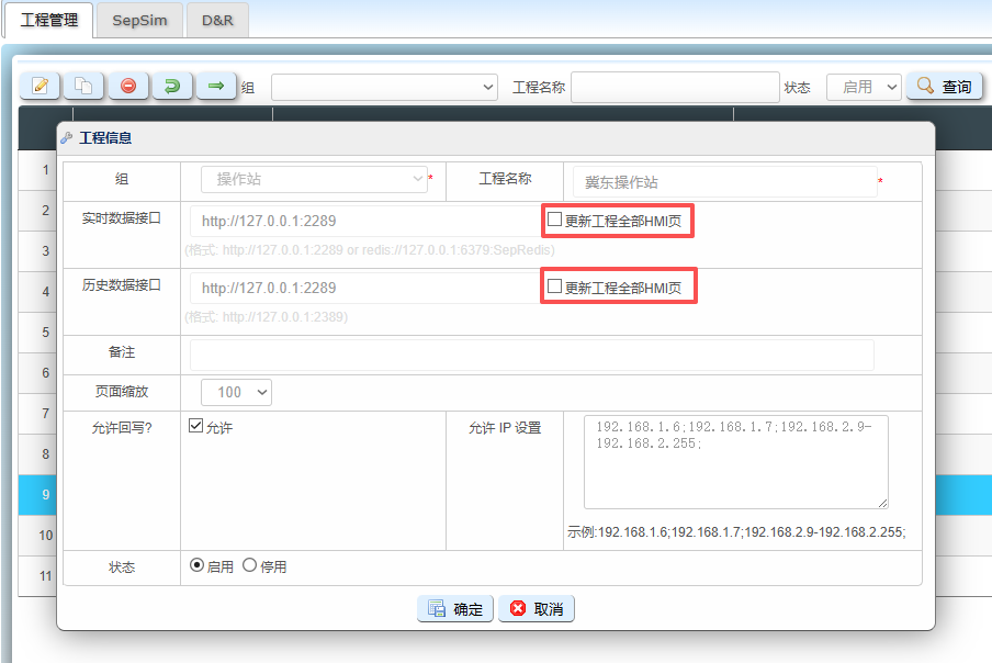 旧版本在编辑保存工程信息的时候,默认会把工程中的数据接口直接同步覆盖到该工程下所有HMI页上,这造成了某些项目的某些页面进行的单独接口地址被错误的覆盖,所以此处增加此选项,在实施时可以根据实际情况进行选择,不勾选,则不会对HMI页进行修改。
