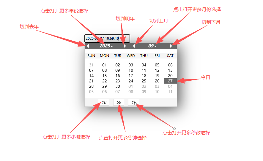 日历可以选择年、月、日、时、分、秒。