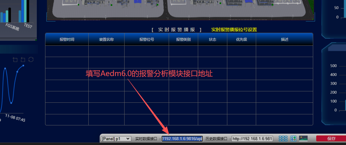 在SEPHMI组态中配置的接口地址,是Aedm6.0中的报警分析模块的接口地址,固定格式为:http://192.168.1.6:9816/api,其中的192.168.1.6根据项目实施中的实际IP进行调整。