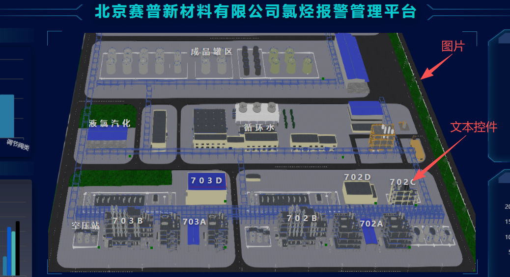 中间的地图是一张厂区图图片,在实际应用中可自行进行图片的上传和更换,如果需要嵌入外部二维、三维地图或者界面,可以使用iframe控件来实现;模板里地图上的标注是用文本控件进行标注的,可以通过位号表里的位号实现一些统计数据功能,即某个装置或区域当前报警数量是多少,等等。