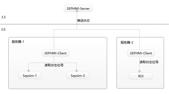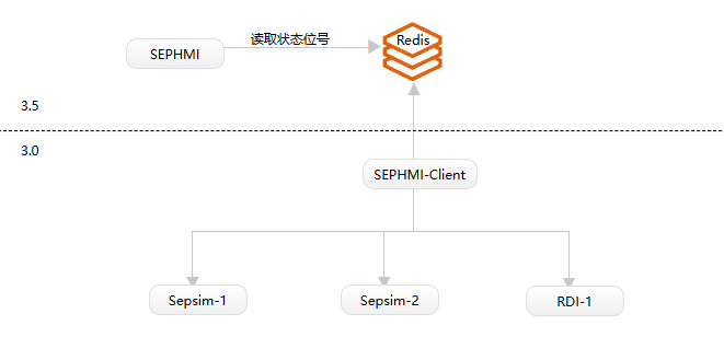 是指监控端SEPHMI(以下用SEPHMI-Monitor代替)无法直接向被监控端的Sepsim请求数据,这个时候需要中转数据。这种情况有两个方案:一是按上面4.2.2的CS模式来实现;二是如果实际情况不能使用CS模式(CS模式的局限性是导致server端的所有数据请求会整体都需要client端的SEPHMI来提供,可能不适用于所有场景),则可以改成上层网络部署Redis,下层SEPHMI来中转数据给Redis的方式来实现,即在Sepsim服务器上或相同网络环境下的其他服务器上部署一个SEPHMI(以下用SEPHMI-Client代替),让它去读取RDI的状态,然后转发给上层Redis(监控端SEPHMI-Monitor能够连接到的Redis),SEPHMI-Monitor上注册这个Sepsim软件的时候,Address则配置为Redis的连接地址即可。