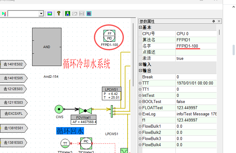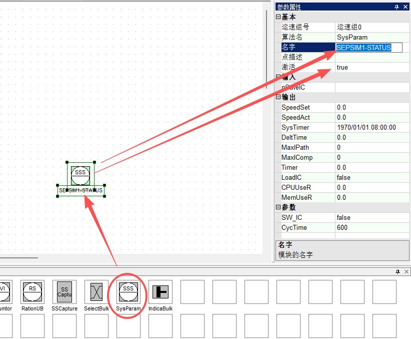 2、点击SysParam算法图标,拖入流程图组态区域,将激活设置为true,然后设置该位号名称,如:SEPSIM1-STATUS,位号名可以自定义,但最终需要与监控端SEPHMI中软件注册信息中的状态位号名称保持一致: