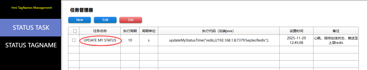 3、进入“STATUS TASK”菜单,新建一个任务,执行周期可设置为10s(可根据实际情况进行调整,为了不影响sephmiB的整体性能,建议不要设置过小),执行代码“updateMyStatusTime("redis://192.168.1.6:9379:SeptecRedis");”,其中updateMyStatusTime为系统函数,代表更新一个状态时间到一个接口地址上,括号中用双引号包起来的内容,就是目标接口地址,当前填写的就是一个Redis地址。