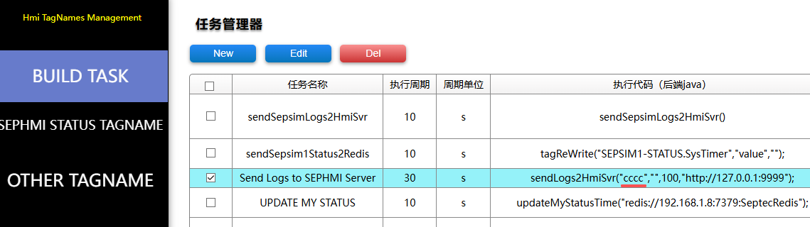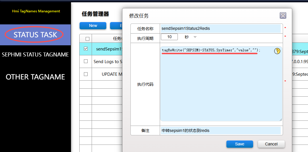 进入STATUS TASK,创建一个新的任务,任务的内容是tagReWrite("SEPSIM1-STATUS.SysTimer","value","");即内容是定期回写SEPSIM1-STATUS.SysTimer这个位号,回写值固定写的是“value”,这个代表回写值不是一个固定的值,而是需要去动态读取,读取的数据源是在上一步中设置的读取地址;第三个参数为空,这个参数是指回写到哪里,即目标接口地址,为空代表该地址,也是在上一步中配置的回写地址,如果不为空,则以此处配置的地址为优先。