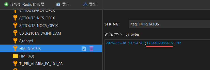 5、Redis验证:可用一个Redis客户端连接到服务器redis之后,找到tag:HMI-STATUS这个key,看其值是否会根据周期时间进行变动。