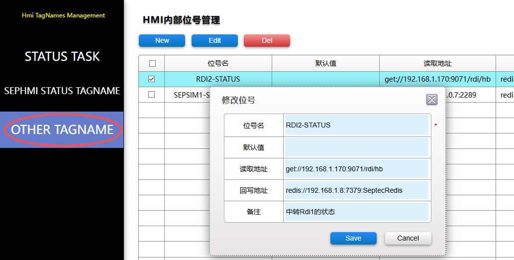 2、进入到OTHER TAGNAME菜单,添加一个新的位号,位号名可以自定义,但是最终需要与SEPHMI-Monitor端注册时的状态位号名一致;