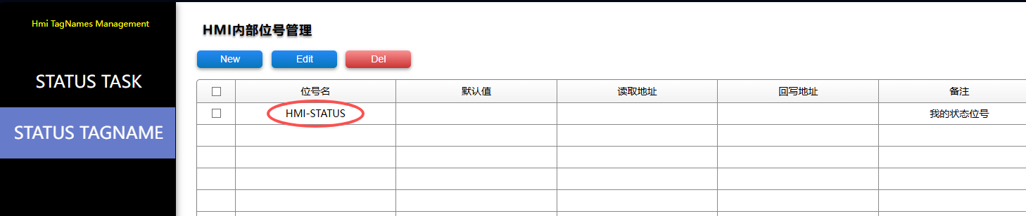 2、进入“STATUS TAGNAME”菜单,并添加一个状态位号,以下将以名称“HMI-STATUS”为例;