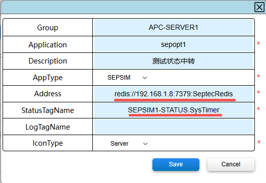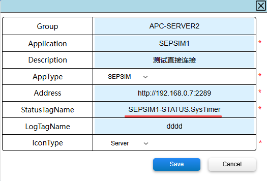 在Address中直接配置Sepsim的接口地址,并且StatusTagName配置为Sepsim里的状态位号名称,但是注意,这个位号是有个特定的后缀SysTimer,如上面的“SEPSIM1-STATUS”,在此配置的时候位号名为“SEPSIM1-STATUS.SysTimer”