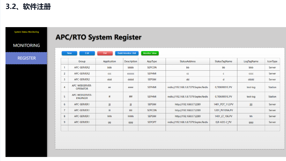 即配置当前SEPHMI作为被监控对象时,定时向监控端SEPHMI发送自己的日志,logTagName是日志位号,需与在监控端SEPHMI里注册的软件信息中的日志位号一致,以此产生关联;logType为限定的日志类型(info、erro、alarm、event),如果推送全部可以填空或者*;maxDataCount可以限定每次推送多少条,为空时默认最大1000条;ioUrl为监控端SEPHMI的地址。