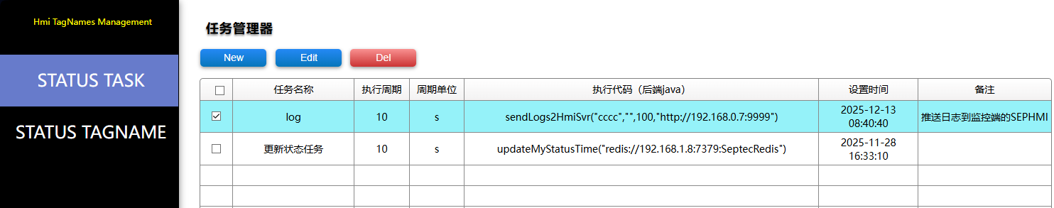 1、下载自定义定时任务管理模板,将模板工程导入到被监控端的SEPHMI,并创建一个新的任务,这个任务使用sendLogs2HmiSvr方法: